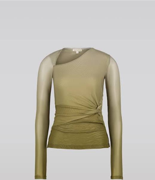 Fitted gradient mesh top with partial lining, asymmetrical neckline, knot detail at was it and side slits.
